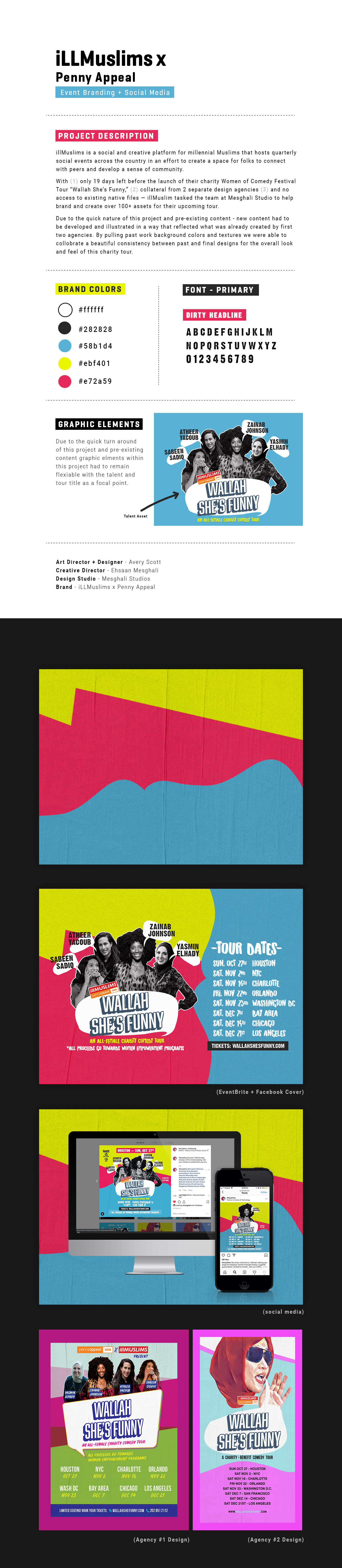 illMuslims is a social and creative platform for millennial Muslims that hosts quarterly social events across the country in an effort to create a space for folks to connect with peers and develop a sense of community. With only 19 days left before the launch with their Women of Comedy Festival Tour “Wallah She’s Funny” and collateral from 2 separate design agencies illMuslims tasked the team at Mesghali Studio to help brand and create over 100+ assets for their tour. Due to the quick nature of this project and pre-existing content - new content had to be formed and illustrated in a way to reflect what was already done. By pulling past agency work background colors and texture I was able to create consistency within past and final work for the overall look and feel of this tour.