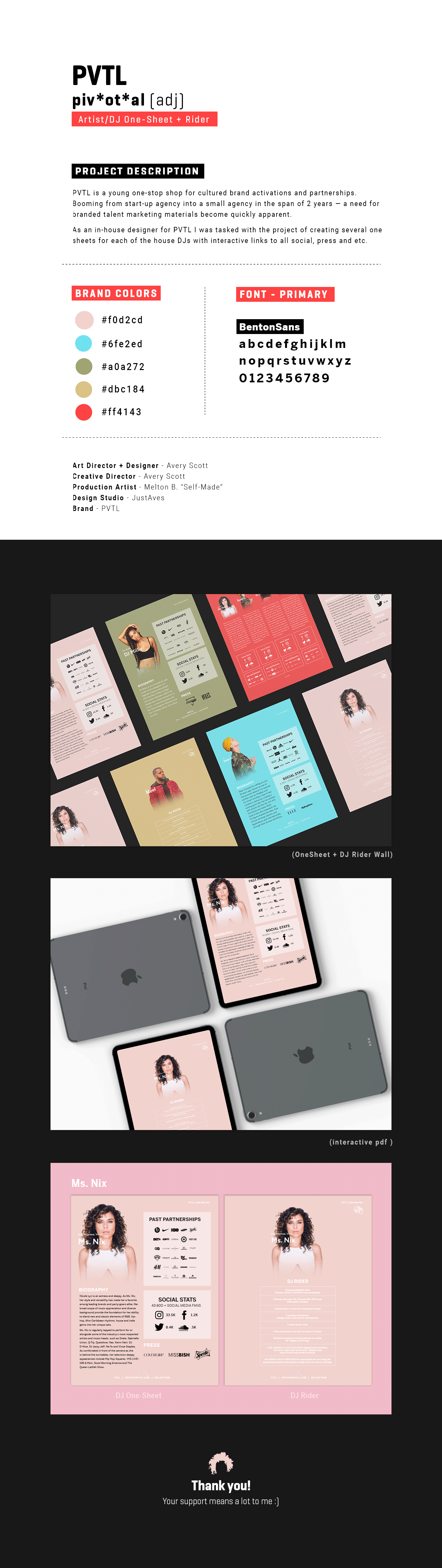 PVTL is a young one-stop shop for cultured brand activations and partnerships located in Los Angeles. Progressing from a start-up into a small agency within the short span of 2 years — a need for single sheet talent marketing materials become quickly apparent. As an in-house designer for PVTL I was tasked with the project of creating several one sheets resumes for each of the house DJs that incorporated the ability to function as an interactive document with links to social, press and etc.